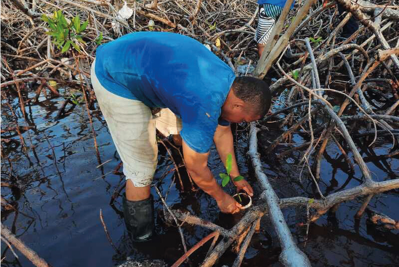 Por esta razón y con el objetivo de recuperar la capacidad reproductiva del manglar rojo y el servicio de protección costera generado por los manglares de borde, diferentes instituciones (MINAMBIENTE, INVEMAR, CORALINA-Mas Bosques y Parques Nacionales Naturales de Colombia) adelantan un plan de rehabilitación de manglares que es implementado en el terreno por 43 familias de Providencia.